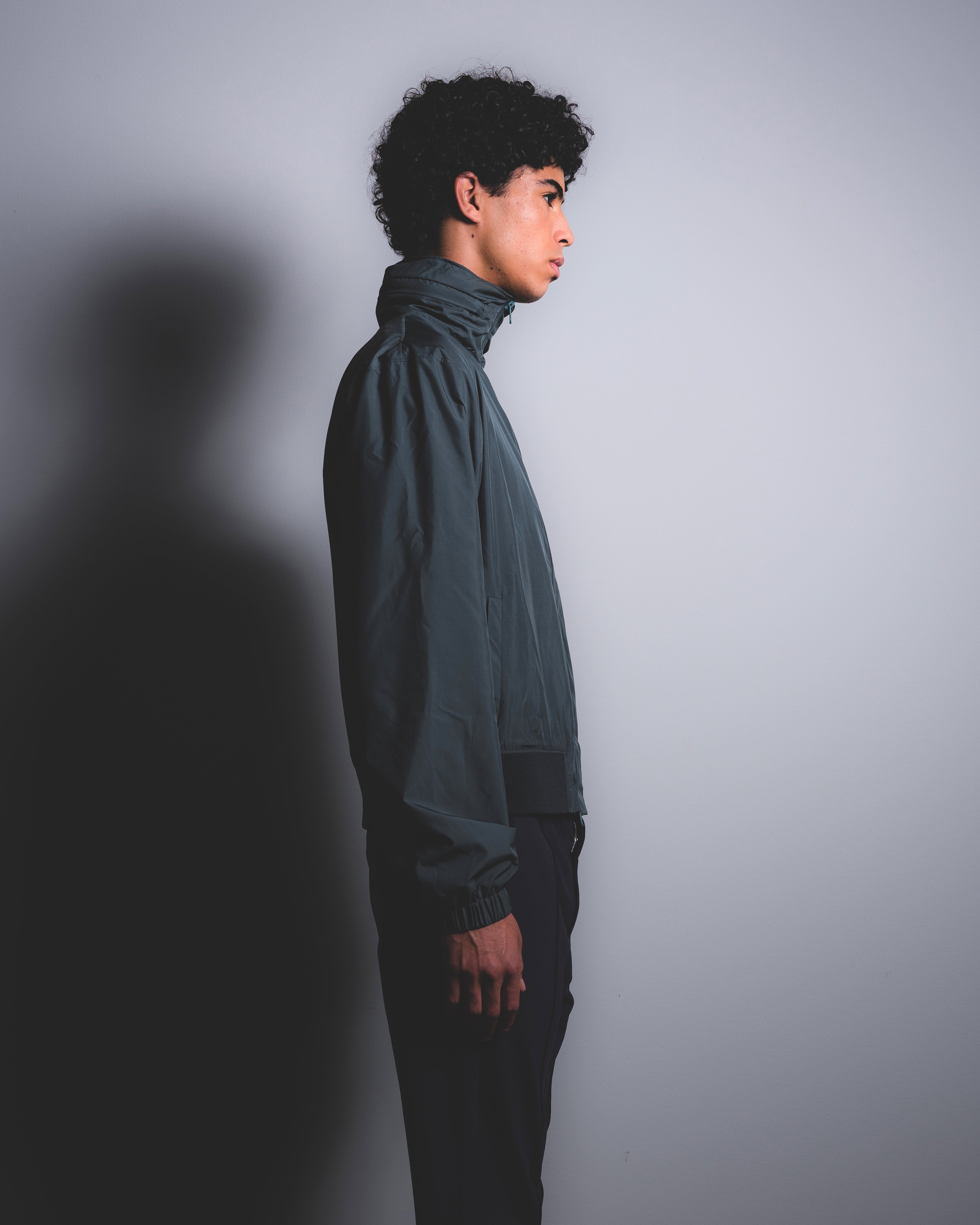 This nylon bomber jacket with knitted trimming, combining a luxurious fabric with a sportive motive. The rubber "STREIM" logo accents its signature. There's a hidden hoodie covered within the collar. The color of this jacket is BLACK GREY.